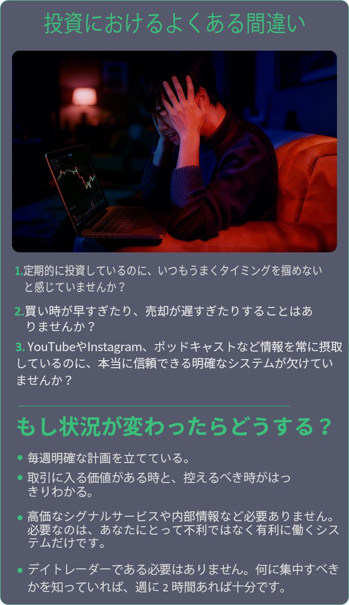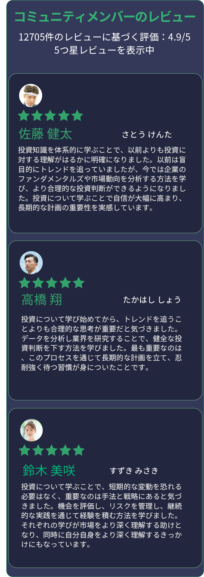 投資におけるよくある間違い ここで何が得られるでしようか? カリキュラム概要(簡潔版) コミュニテイメンバ-によるレビュ-