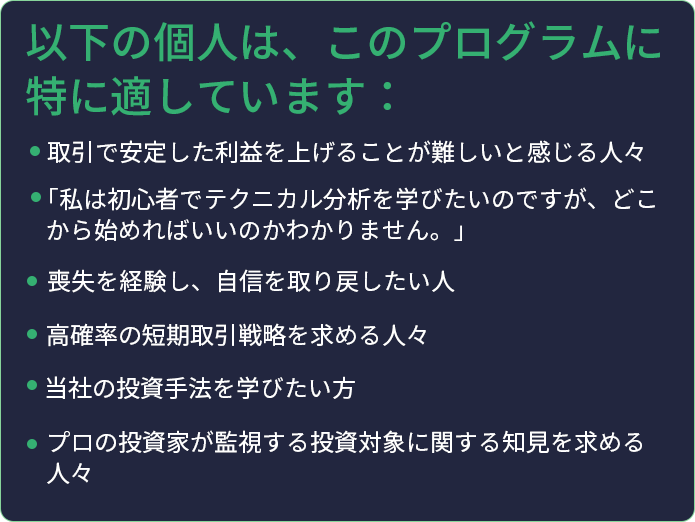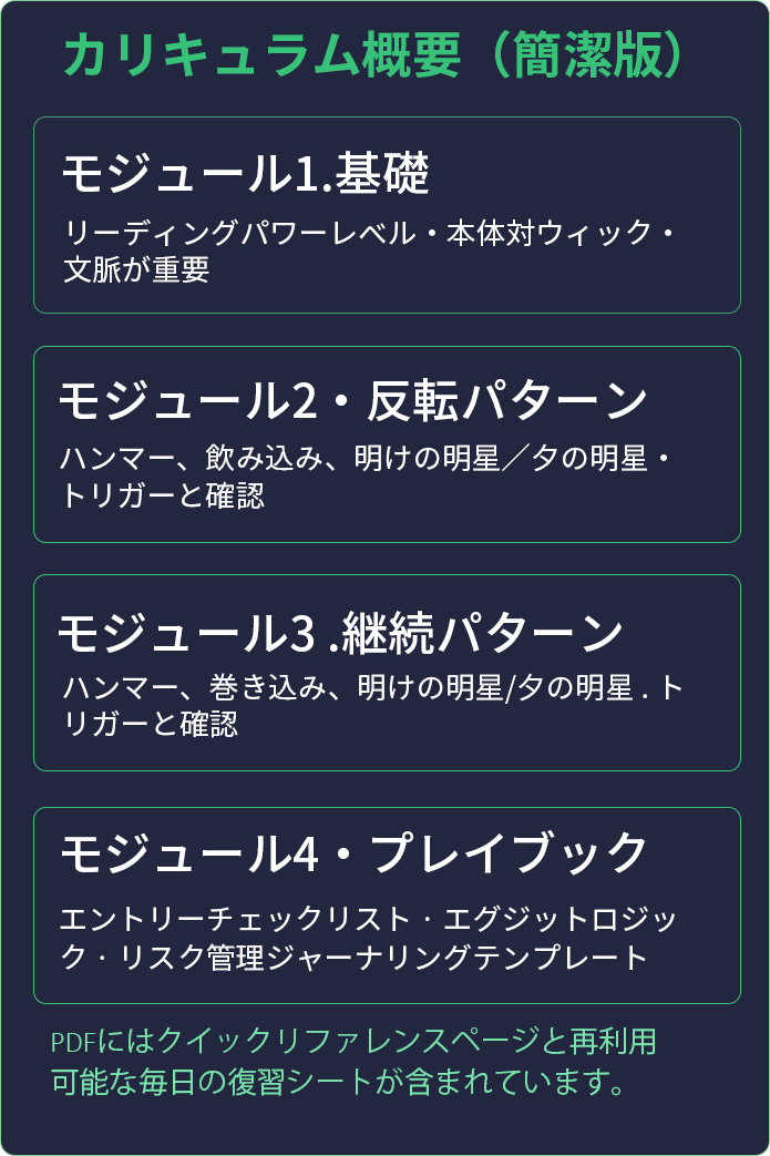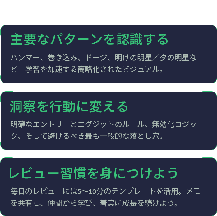 当社のコアパタ-ンを簡潔にまとめたPDFを入手し、エントリ-とエグジットのロジックを段階的に習得しましよう。毎日の復習や仲間との議論ができる勉強会にもご参加ください。